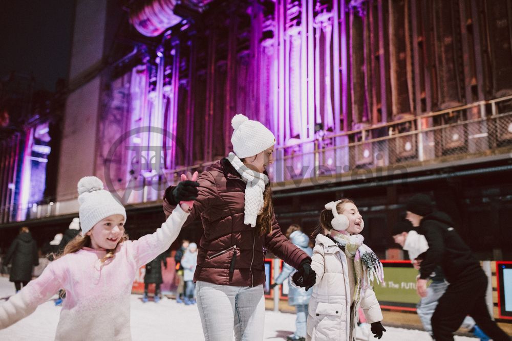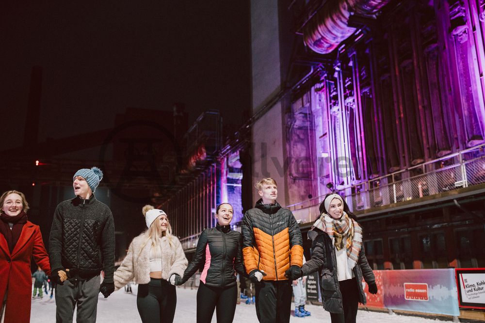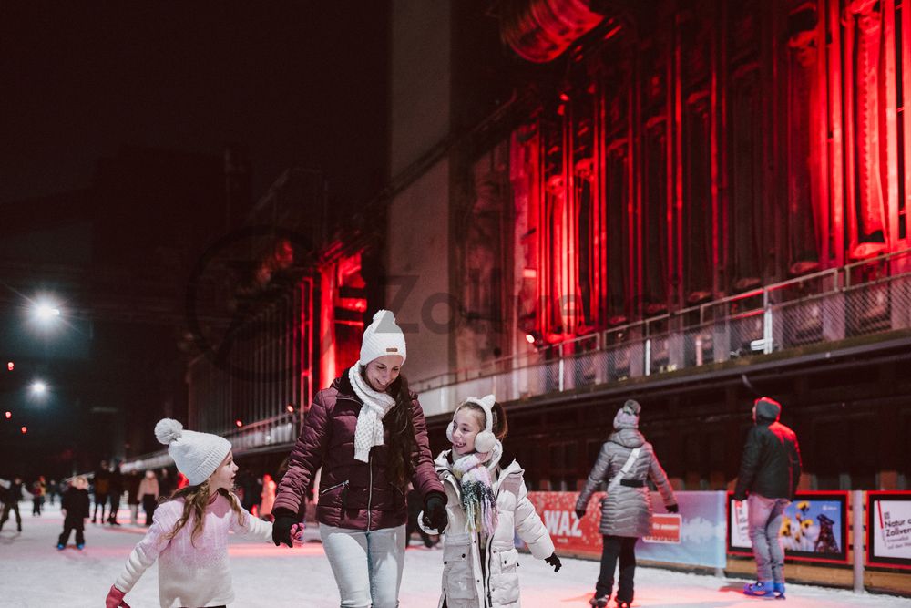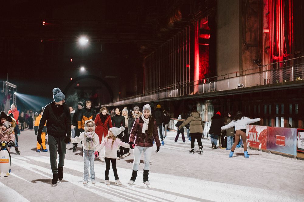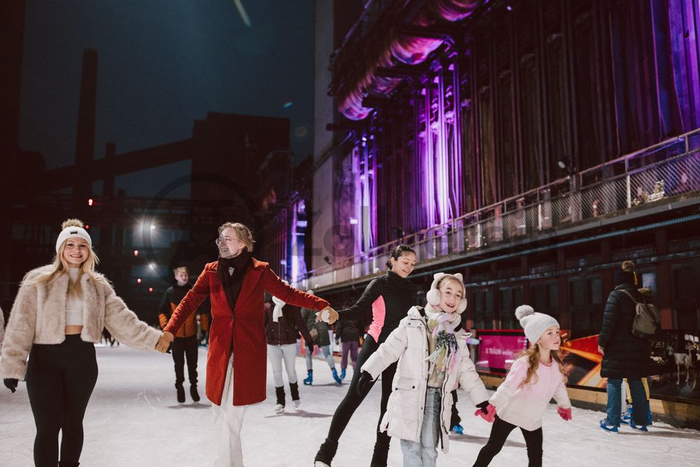 Im Winter verwandelt sich das große Wasserbecken am ehemaligen Druckmaschinengleis auf der Kokerei Zollverein in die 150 Meter lange Zollverein Eisbahn, die zum Schlittschuhlaufen in faszinierender Atmosphäre einlädt.