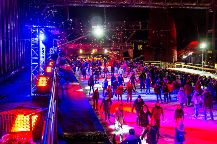In der Wintersaison tummeln sich an mindestens zwei Abenden Discofans und Schlittschuhläufer auf bei der Eisdisco auf der Zollverein Eisbahn, dem “wahrscheinlich faszinierendsten Ort zum Schlittschuhlaufen bundesweit”. Entlang der Koksöfen, in denen einst Kohle bei 1.000 Grad Celsius zu Koks gebacken wurde, erstreckt sich im Winter über eine Länge von 150 Meter die Zollverein Eisbahn. Insbesondere am Abend, wenn die 1.800 Quadratmeter große Eisfläche mit der Installation „Monochromatic Red and Blue“ (1999) von Jonathan Speirs und Mark Major zu einem beeindruckenden Lichtkunstwerk.in atmosphärisches Licht getaucht wird, verspricht das Schlittschuhlaufen vor der beeindruckenden Kulisse der Kokerei Zollverein ein einzigartiges Erlebnis.