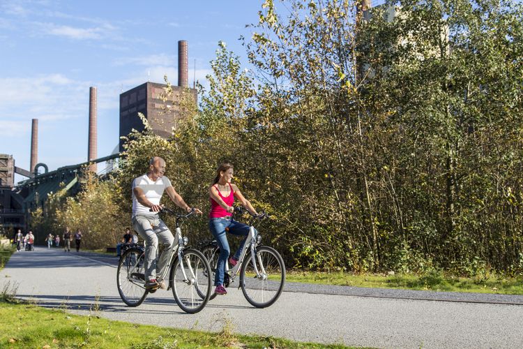 Paar auf Fahrrädern auf der Ringpromenade auf der Kokerei