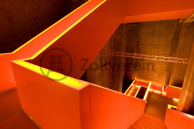 Nördliches, orange illuminiertes Treppenhaus im Ruhr Museum