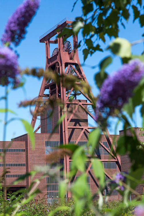 Flieder vor dem Doppelbock-Fördergerüst von Schacht XII