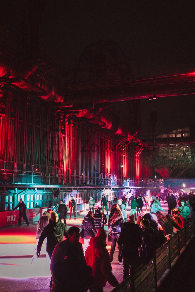 Insbesondere am Abend, wenn die 1.800 Quadratmeter große Eisfläche mit der Installation „Monochromatic Red and Blue“ (1999) von Jonathan Speirs und Mark Major zu einem beeindruckenden Lichtkunstwerk in atmosphärisches Licht getaucht wird, ist das Schlittschuhlaufen vor der beeindruckenden Kulisse der Kokerei Zollverein ein einzigartiges Erlebnis.